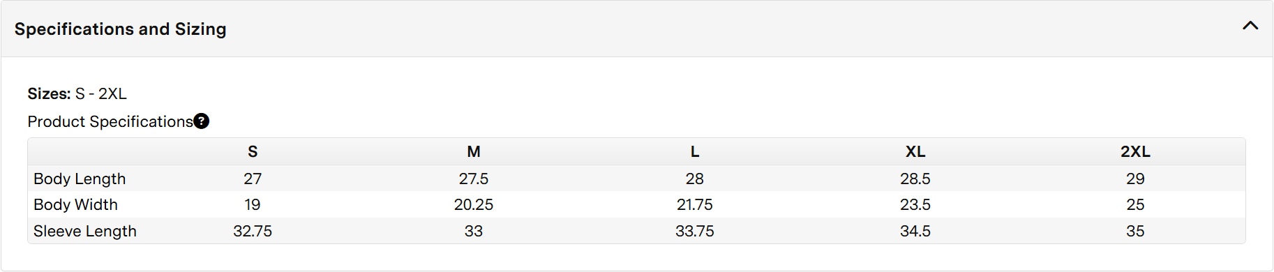 Size | S, M, L, XL, 2XL |